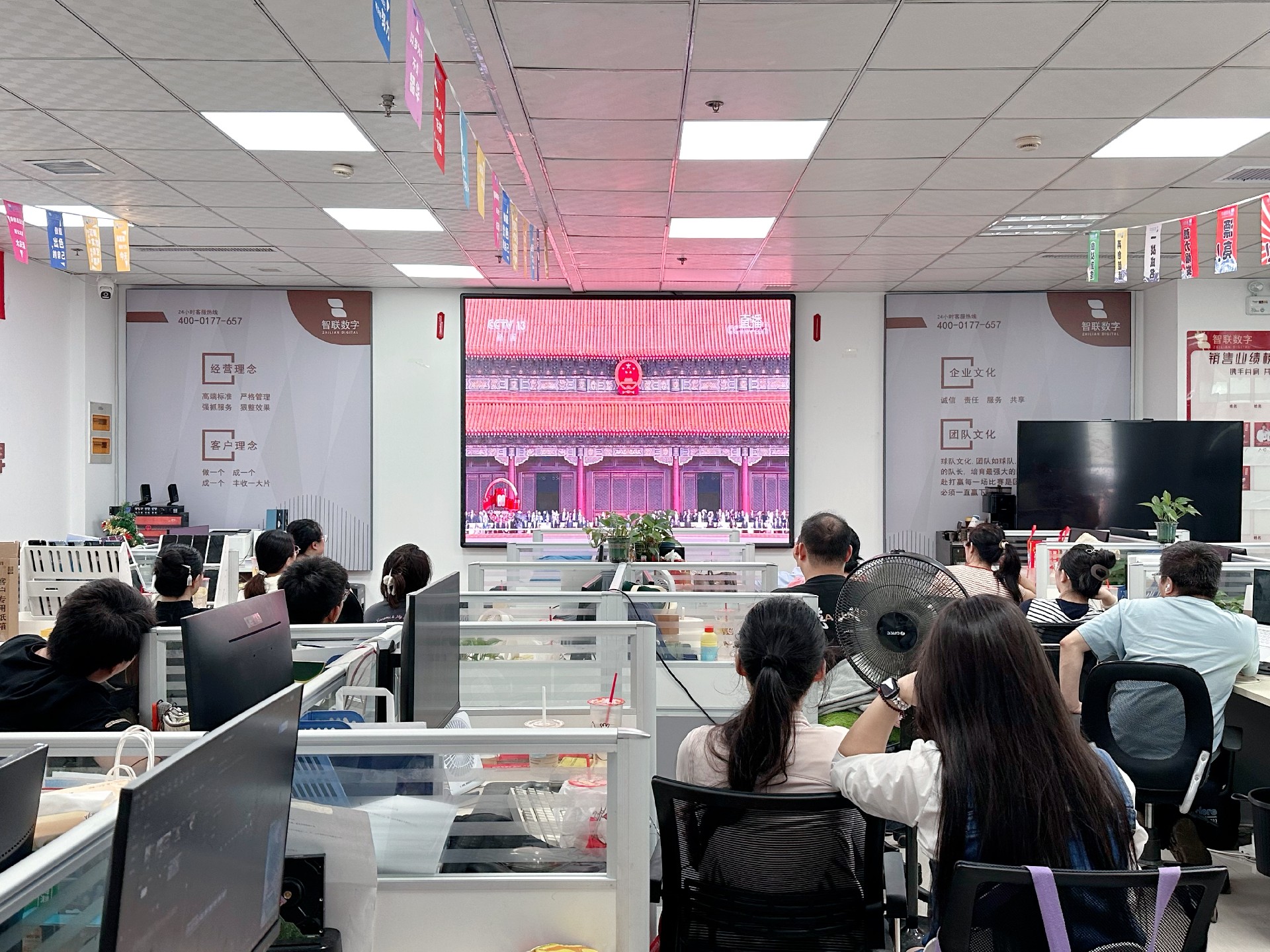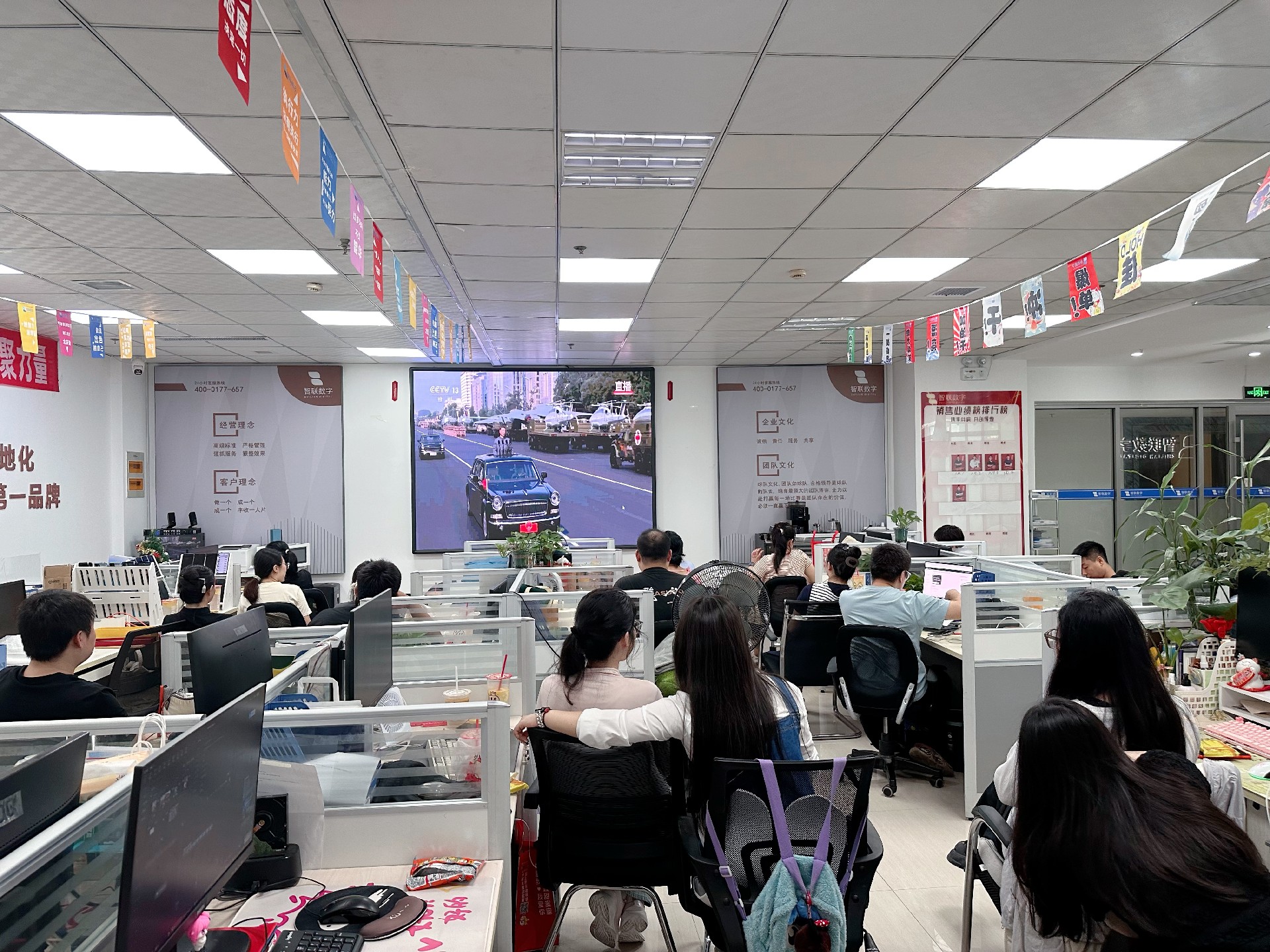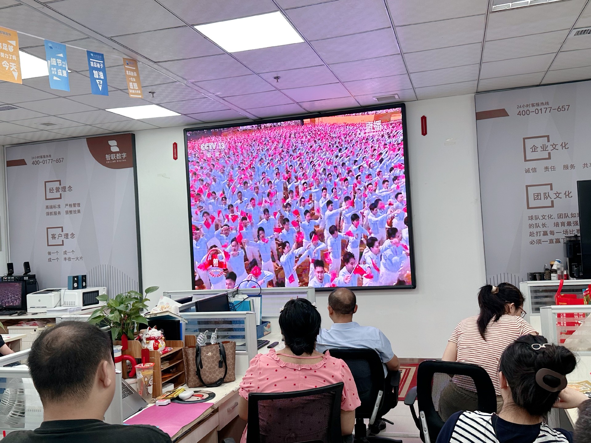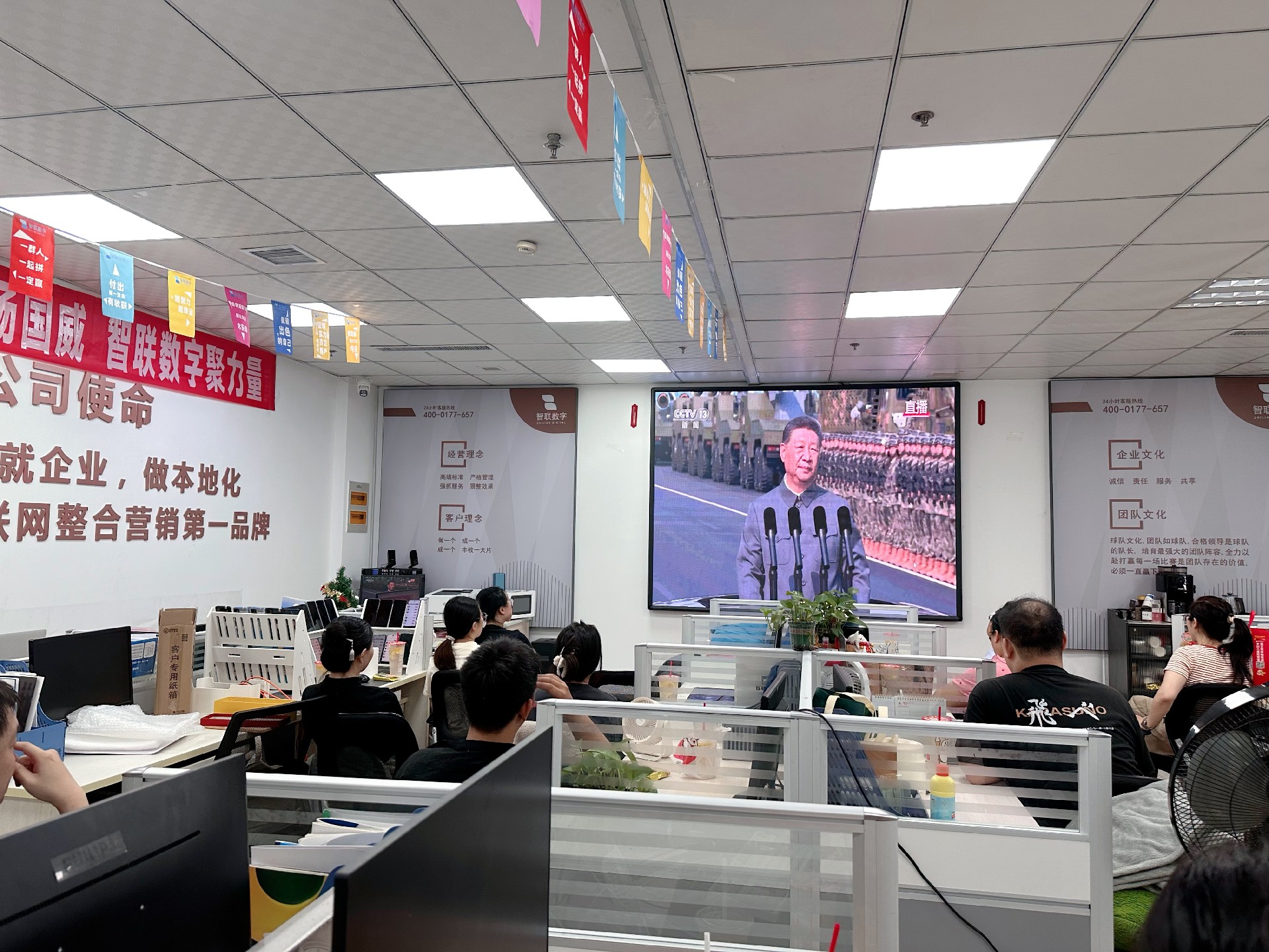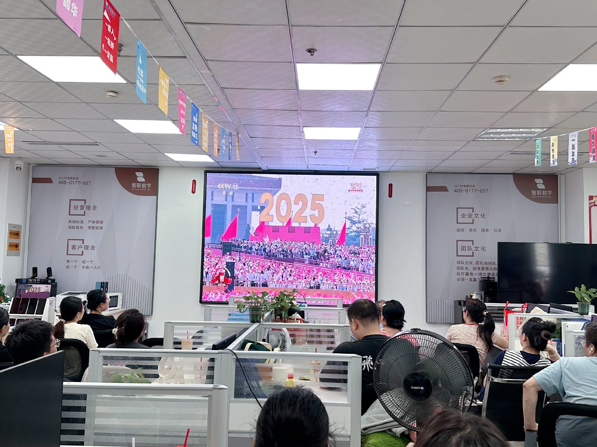 9月3日上午,纪念中国人民抗日战争暨 世界反法西斯战争胜利80周年活动在北京天安门广场隆重举行。智联数字统一安排组织全体员工集中观看实况直播,共同见证这一承载民族记忆、彰显大国担当的历史时刻。